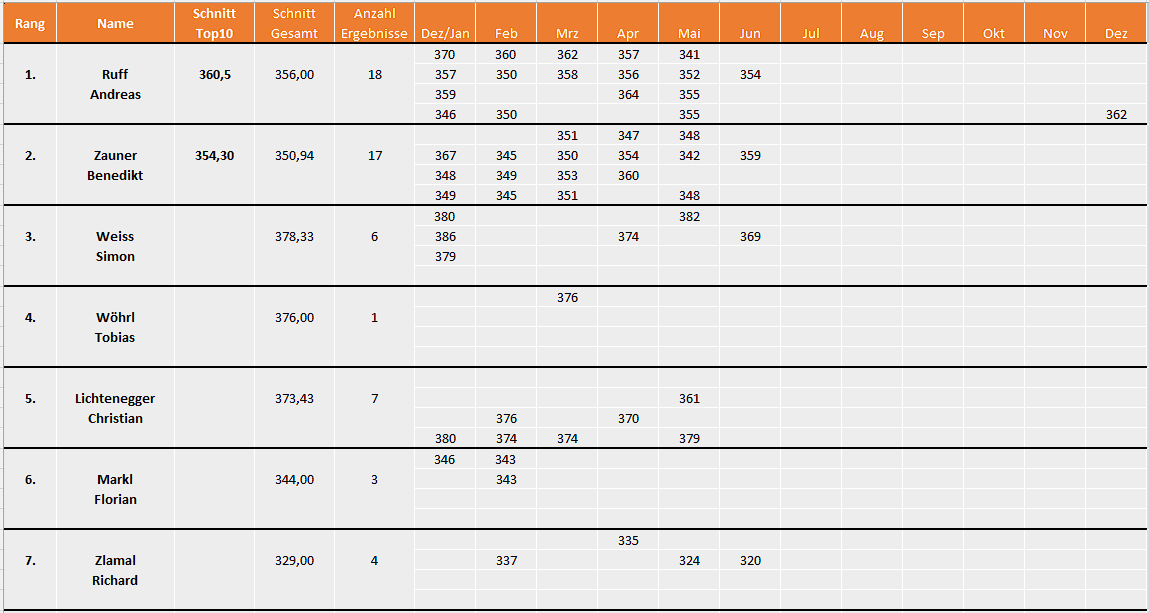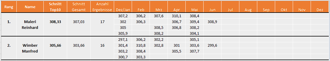 Zur Teilnahme an der Jahreswertung werden mindestens 10 Ergebnisse benötigt. Die Platzierung ergibt sich aus dem Durchschnitt der 10 besten Ergebnisse.