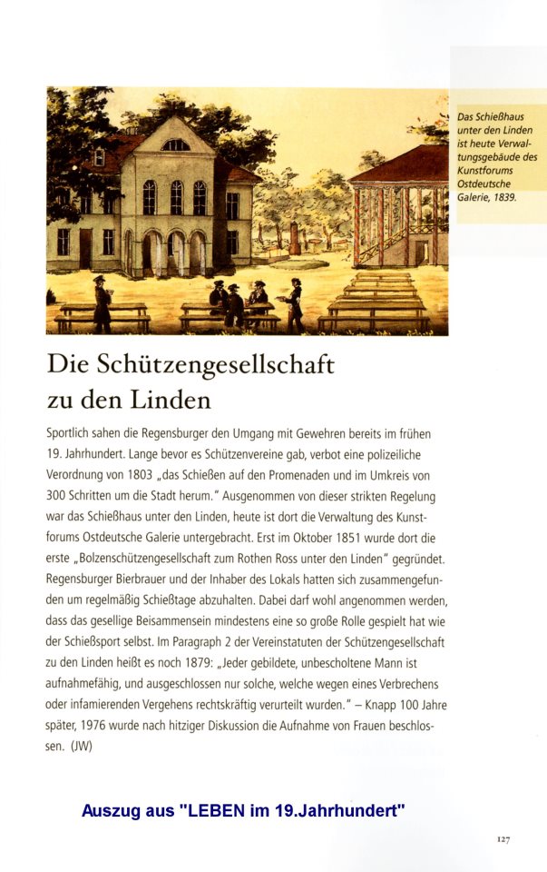 | Anfang Okt. 1851 | wurde die erste Bolzschützengesellschaft in Regensburg gegründet, die Bolzenschützengesellschaft "Zum rothen Ross unter den Linden'" Eine gesellige Runde von Schützen hat sich zusammen gefunden, um dem Schießsport nachzugehen. Es waren Bierbrauer und der Inhaber des Lokals. Bereits in diesem Jahr haben regelmäßige Schießtage stattgefunden, da Anfang 1852 schon das neunte Kranzl-Schießen stattfand. |